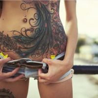 Tatuaż biomechanika z motywem żeber. wygląda to tak jakby skóra była w danym miejscu ściągnięta i prezentowała wnętrzności. Po prawej stronie z ciała wyskakuje niewielka postać przypominająca obcego.