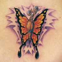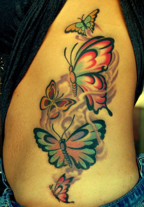 Tatuaż przedstawiający pięć kolorowych motyli. Dwa z nich są większe od trzech pozostałych. Mają różnobarwne skrzydła, wykończone czarnymi konturami. W tle widoczne delikatne cienie.