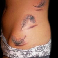 Kobiecy tatuaż na brzuchu z motywem smoka, który stanowi część gałązki dla kwiatów wiśni. Znakomicie zestawiony projekt. Delikatny i piękny tatuaż.
