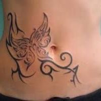 Czarno żółta jaszczurka jako tatuaż na brzuchu.