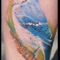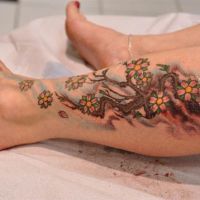 Znakomity tatuaż na łydce z motywem Halloweenowym. Kot w pomarańczowej dyni.