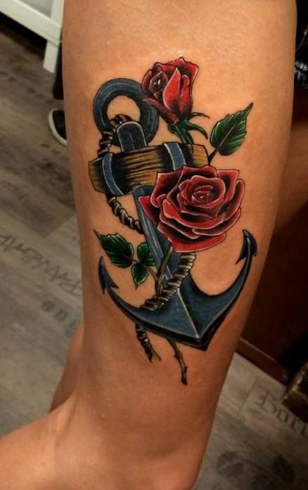 Ładny tatuaż z kotwicą i kwiatem róży.