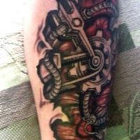 Niesamowity tatuaż z metalowymi częściami, dziara wyglądają jakby elementy były pod skórą. Doskonały projekt i wspaniałe wykonanie. Biomechanika potrafi być dziełem sztuki.
