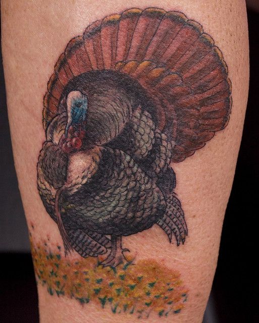 Wyjątkowy tatuaż z ptakiem. Indyk to bardzo dekoracyjny wzór tatuazu.