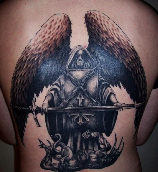 Zdjęcie tatuażu na plecach z aniołem. postać ma metalowa tarcze na piersiach, ogromne skrzydła w brązowym kolorze, a dłoniach trzyma długi miecz. Anioł stoi nad wijącą się po ziemi kreaturą.