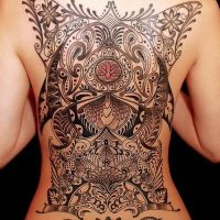 Kokarda wygląda jak prawdziwa, jest to doskonale zrobiony tatuaż. Czarna kokarda z koronki w 3D. Piękny tatuaż na plecach, bardzo podoba mi się ten wzór.