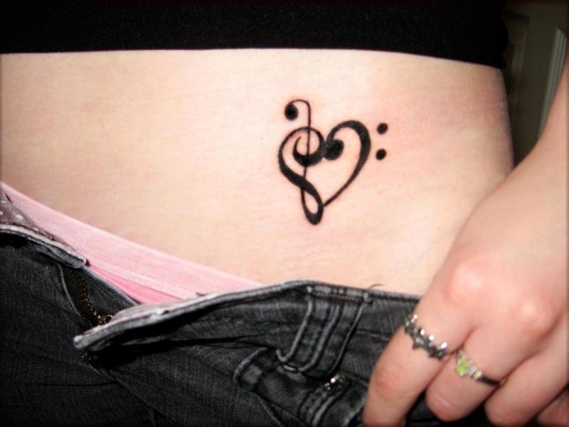 Niewielki tatuaż na brzuchu z czarnym wzorkiem. Serduszko z nutki i klucza wiolinowego.