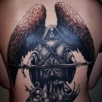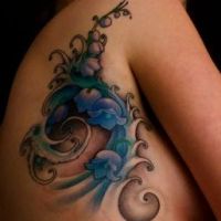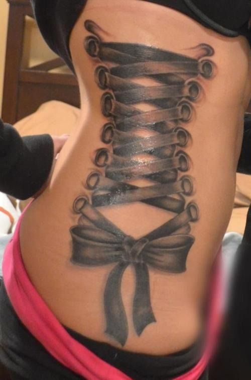 Tatuaż rozpoczynający się na biodrze, a kończący się na żebrach. Czarna wstążka jako sznurowanie gorsetu zawiązana na kokardę. Tatuaż został znakomicie wykonany, widoczny jest efekt ściągania skóry. Prawdziwe dzieło sztuki.