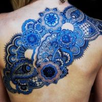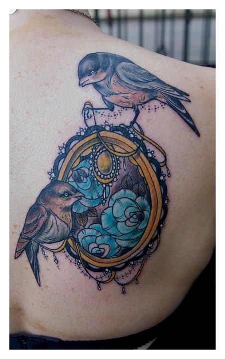 Ciekawy tatuaż na plecach z motywem ptaków oraz kwiatów. Niebieskie rośliny w ozdobnej ramce wokół której są dwa ptaki.