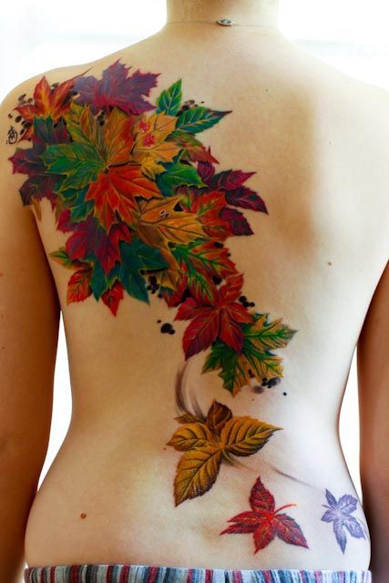 Tatuaż na plecach z kolorowymi liśćmi. Liście w rożnych kształtach i kolorach - żółte, zielone, czerwone i pomarańczowe.