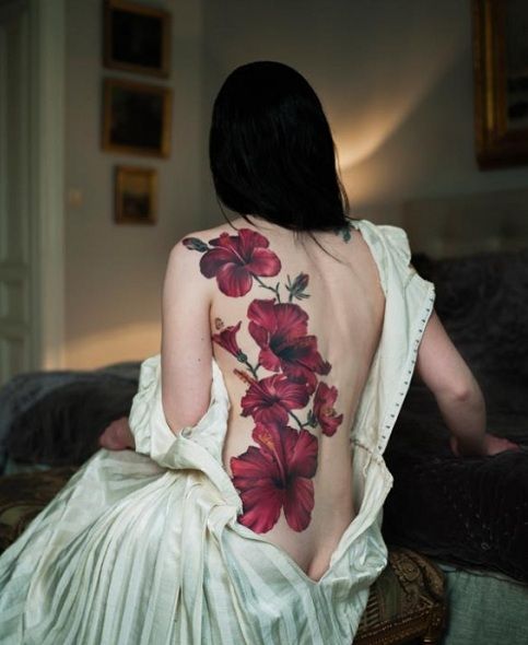 Wspaniałe zdjęcie kobiety w jasnej sukni z odsłoniętymi plecami na których jest duży tatuaż. To wzór z kwiatami hibiskusa, w ciemno czerwonym kolorze.