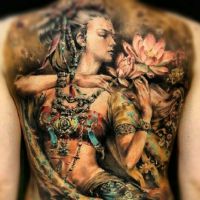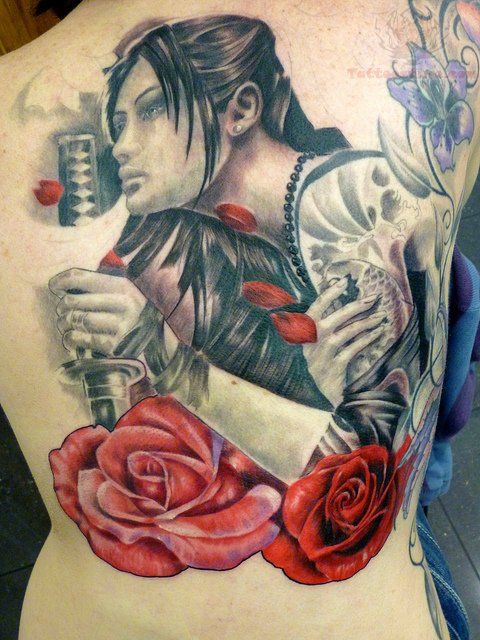 Tatuaż na całe plecy z motywem kobiety i kwiatów. Piękna kobieta o długich ciemnych włosach w jednej ręce trzyma miecz wbity do połowy w czerwone kwiaty. Róże i płatki są czerwone, reszta w ciemnych kolorach.