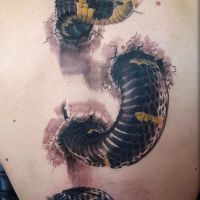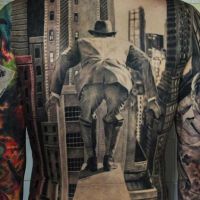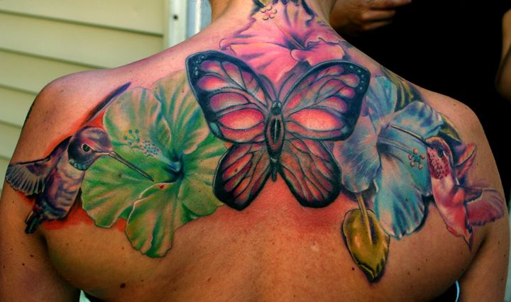 Trzy duże kwiaty hibiskusa w różnych kolorach: zielonym, niebieskim i różowym. Po prawej i lewej stronie dwa ptaki. Są to kolibry z cienkimi a długimi dziobami. po środku tatuażu jest ogromny motyl w kolorze czerwono-czarnym.