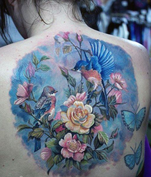 Robiący ogromne wrażenie tatuaż na plecach z motywem kwiatowym i nie tylko. Na niebieskim tle duża ilość kolorowych kwiatów, obok dwa ptaki i motyle. Całość prezentuje się bardzo dobrze. Tatuaż znajduje się na plecach.