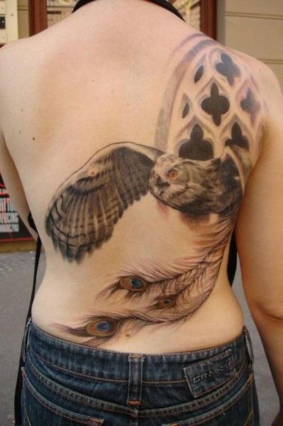 Oryginalny tatuaż z motywem ptaka. Sowa w locie z ogromnymi skrzydłami i piórami pawimi.