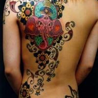 Piękny tatuaż z niebem w cudownym błękitnym kolorze. Skrawek nieba wytatuowany jakby był pod skórą, a niektóre jej kawałki po prostu odpadają. Efekt jest niesamowity, a kolor obłędny. Na niebie są białe obłoki, a wokół latają czarne ptaki.