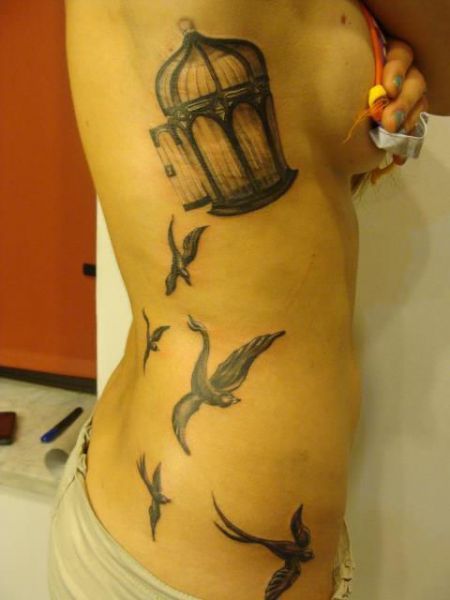 Tatuaż na kobiecym ciele przedstawiający klatkę oraz fruwające wokół niej ptaki.