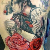 Tatuaż wykonany po lewej stronie pleców. Długi motyw florystyczny z zakręconymi gałązkami i żółtymi kwiatami. W okolicy łopatki jest głowa różowego słonia w turbanie. Słoń ma duże uszy i długa trąbę. Bardzo oryginalny tatuaż.
