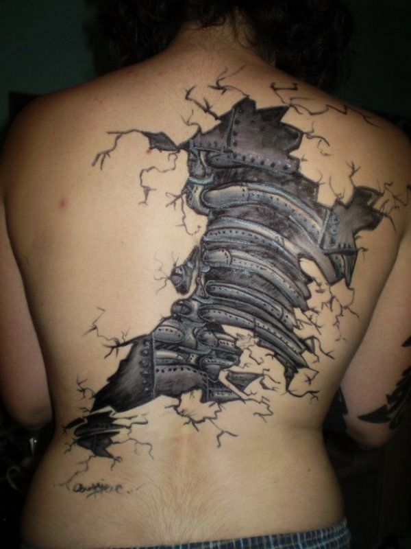 Tatuaż na plecach z motywem biomechanicznym. Fragment rozdartej skóry pod którą widoczne są kości oraz metalowe blaszki i śrubki.