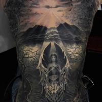 Cztery czerwone róże, czaszka i liście przypominające skrzydła. Tatuaż jest na plecach, dość sporych rozmiarów. Tylko kwiaty są wykonane w kolorze, reszta w odcieniach szarego i czarnego.