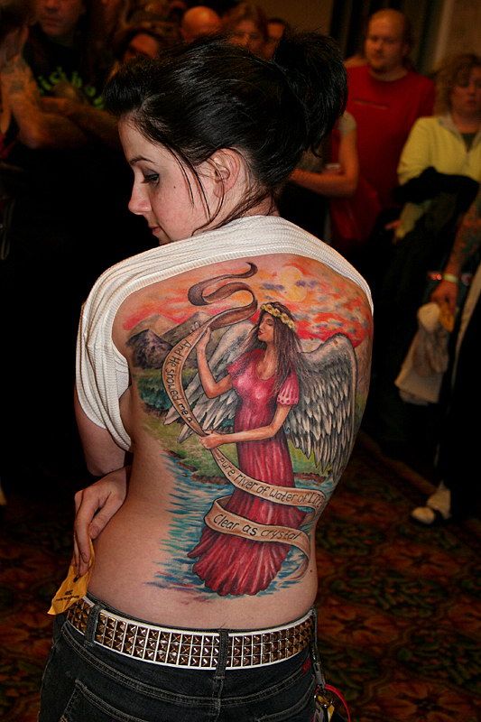 Anioł wytatuowany na plecach młodej dziewczyny. Anielska postać jest piękną kobietą w długich włosach, na których ma założony wianek z kwiatów. Na na sobie długą suknie w czerwonym kolorze. W rękach trzyma długa wstążkę z napisem.