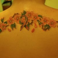 Delikatny wzorek z małymi kwiatuszkami wytatuowany na kręgosłupie. Tatuaż wygląda świetnie.