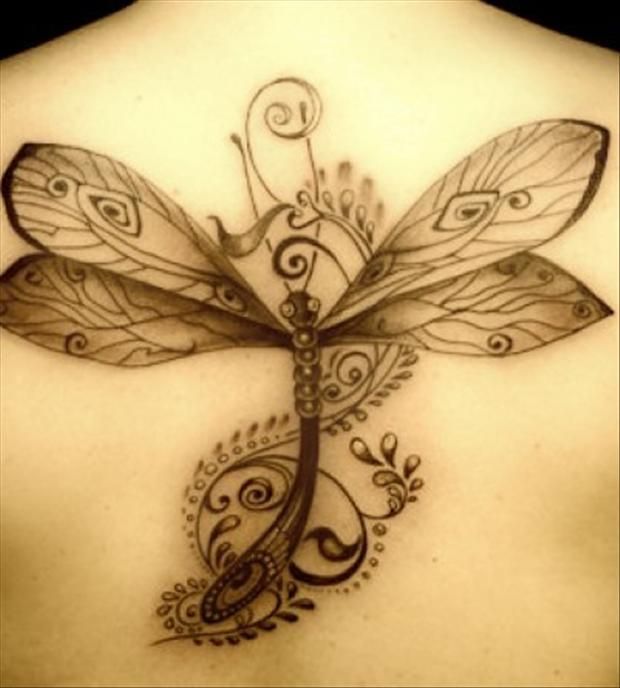 Tatuaż na plecach przedstawiający wazkę. Owad ma dość duże skrzydła, otaczają go ładne wzory i ornamenty. Wygląda to bardzo elegancko.