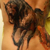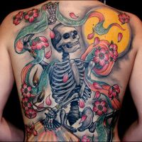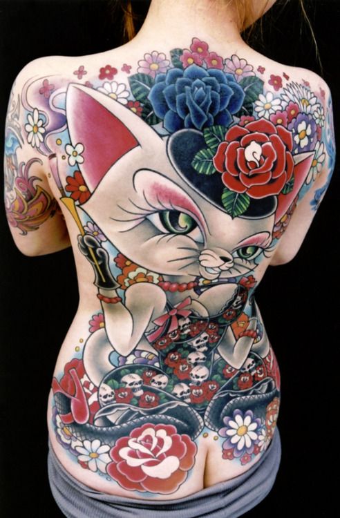 Olbrzymi tatuaż na plecach z bardzo oryginalnym motywem. Największym elementem jest bajkowa kotka w czarnych rajstopach, czerwonych butach, sukience w czaszki i czarnym kapeluszem na głowie. Kapelusz przyozdobiony jest dużym czerwonym kwiatem w kolorze czerwonym. Kotka ma na szyi i na nadgarstkach czerwone korale. W jednej łapie trzyma papierosa. Wygląda bardzo kobieco. Wokół kotki wytatuowane są różnokolorowe kwiatki małych i większych rozmiarów. Są tam stokrotki w kolorze różowym, białym i czerwonych, a także róże. Tatuaż na plecach, ramionach i na części pośladków.