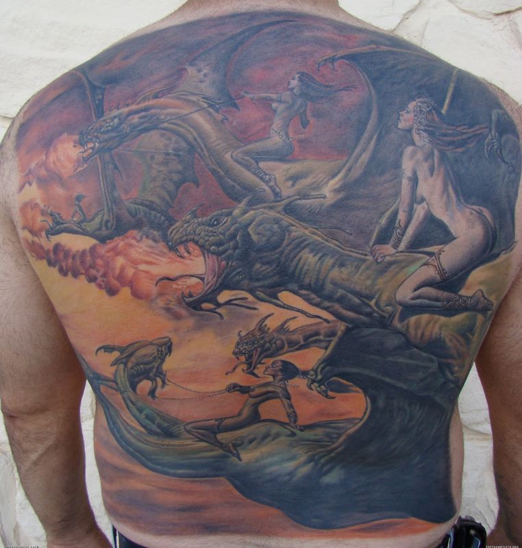 Tatuaż na plecach z motywem smoka. Pięć smoków w locie ogromnymi rozłożonymi skrzydłami. Na trzech z nich siedzą nagie kobiety. w tle jest czerwony płomień pochodzący z pysków smoków.