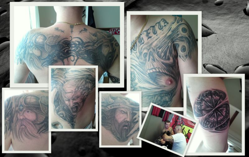 Tatuaże w różnych częściach ciała. Bardzo ciekawe motywy między innymi z głowami demonów, wikingów. Super wykonanie.