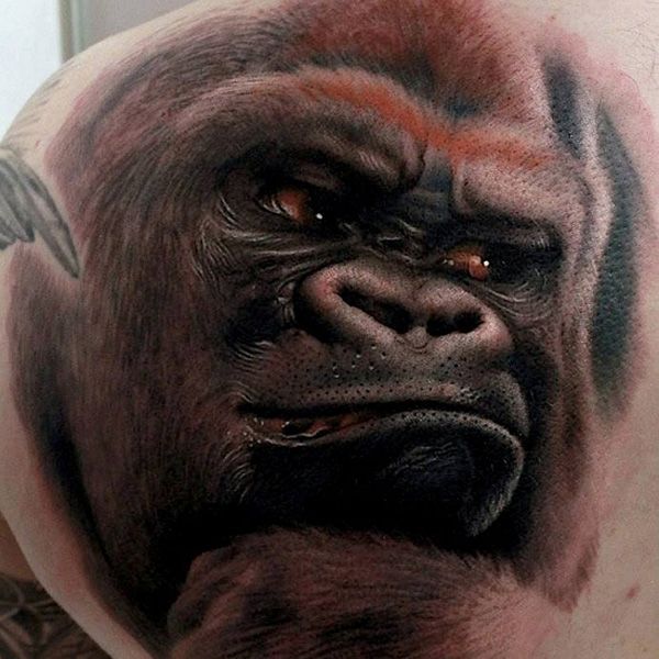 Perfekcyjnie wykonany tatuaż przedstawiający głowę goryla. Twarz tego zwierzaka jest jak żywa. Bardzo dobra robota, kolory są zaskakujące. Tylko podziwiać taką pracę tatuatora.