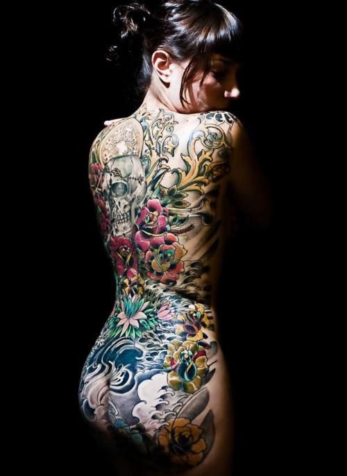 Zdjęcie kobiety z wytatuowanymi plecami i pośladkami. Zestawienie różnorodnych motywów, dużo kolorowych kwiatów, pnączy i elementów roślinnych. Wśród nich czaszka oraz motyw wodny. Genialny tatuaż, kolorowy i robiący ogromne wrażenie.