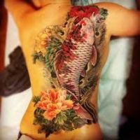 Duży kolorowy tatuaż na plecach, który przedstawia motyla ze wzorkami na skrzydłach.