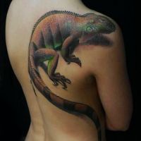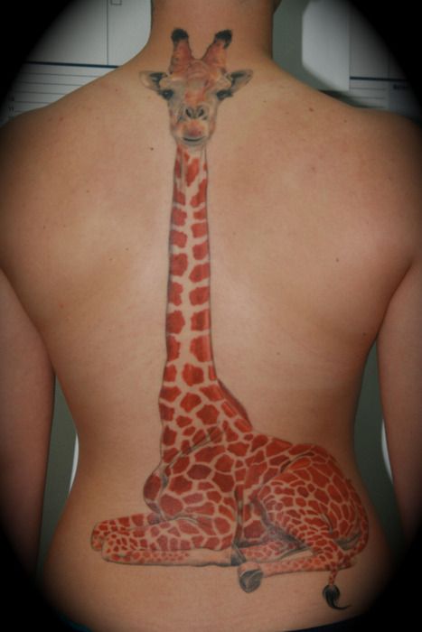 Tatuaż z żyrafą. Zwierzę wytatuowane jest na plecach, długa szyja żyrafy pokrywa się z linią kręgosłupa. Żyrafa ma cętki w kolorze pomarańczowym.