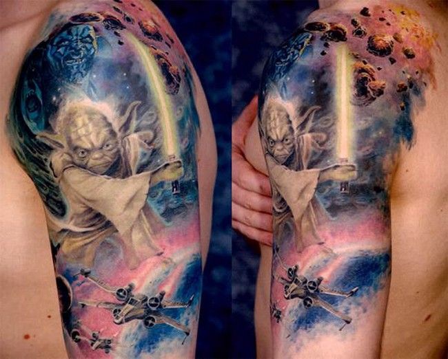 Genialny tatuaż w super kolorach. Galaktyka, planety i meteoryt a wśród nich postać obcego z mieczem.