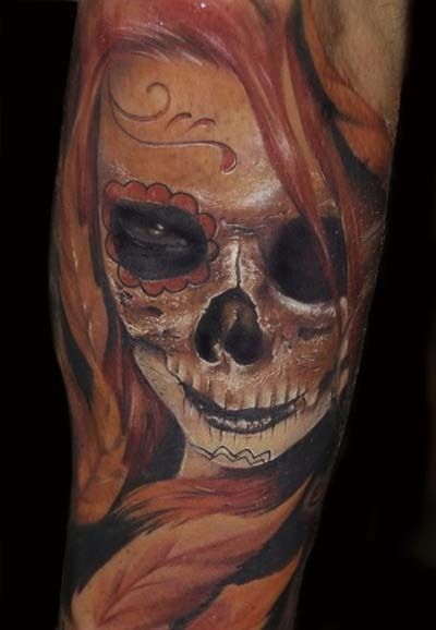 Tatuaż z twarzą zombie. Dziewczyna o rudych włosach i wzorami wymalowanymi na twarzy.