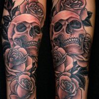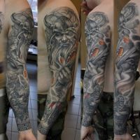 Interesujący tatuaż z oryginalnym motywem. Wspaniałe kolory i detale. Projekt wykonany na całej ręce.