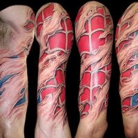 Rękawek na lewej ręce z kilkoma motywami. Na ramieniu jest dość duża czaszka z kwiatem przy skroni. Na wysokości łokcia wytatuowane jest oko z długimi rzęsami. Do samego nadgarstka rozciąga się wzór z trójwymiarowej kostki.