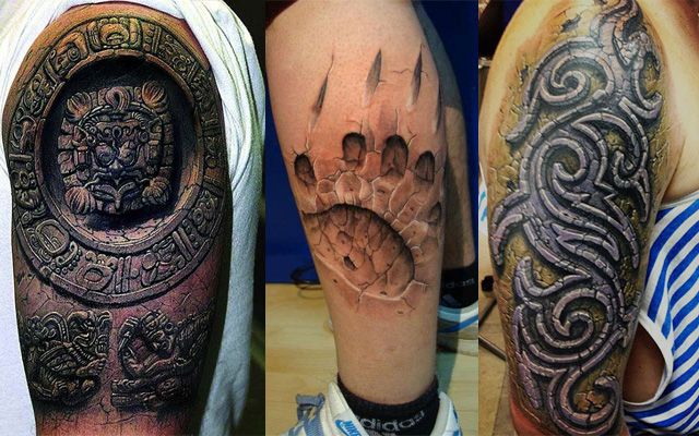 Przykłady tatuaży trójwymiarowych. Trzy rodzaje na jednym zdjęciu. Pierwszy tatuaż od lewej przedstawia kamienny symbol i dwie postacie pon nim. Drugi tatuaż to odbity odcisk łapy zwierzęcej. Ostatni tatuaż wygląda jak kamienny tribal.