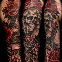 Tatuaż przedstawiający głowę młodej, atrakcyjny kobiety. Na ciemnych włosach ma kolorową chustę z łańcuszkami i koralikami. Głowę ma podpartą na jedynej z dłoni.