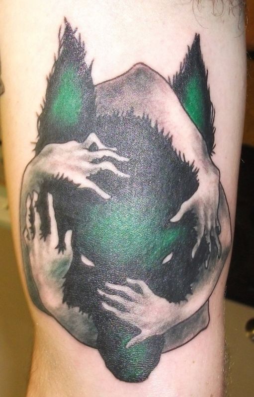 Ciekawy tatuaż z głowa zwierzęcia, które obejmują dwie pary dłoni. Głowa wilka jest pokryta futrem w kolorze zielono-czarnym.