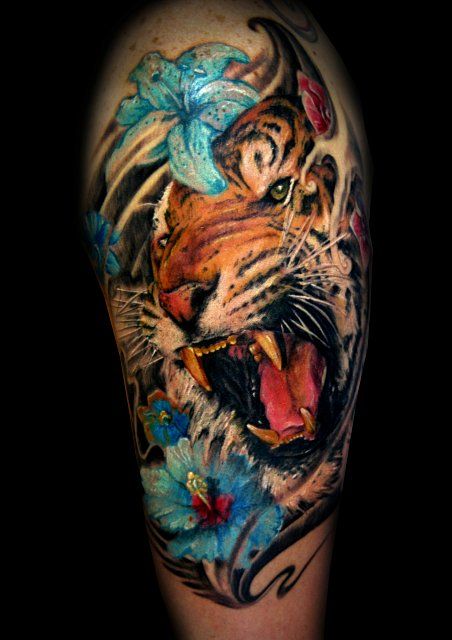 Kolorowy tatuaż z głową tygrysa i niebieskimi kwiatami wokół niej. Tygrys ma otwarty pysk, w którym widoczne są białe kły.