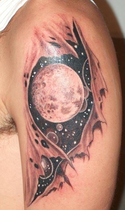 Niesamowity tatuaż w stylu biomechaniki. Efekt rozdartej skóry, spod której wyłania się fragment kosmosu, planety na ciemnym tle.