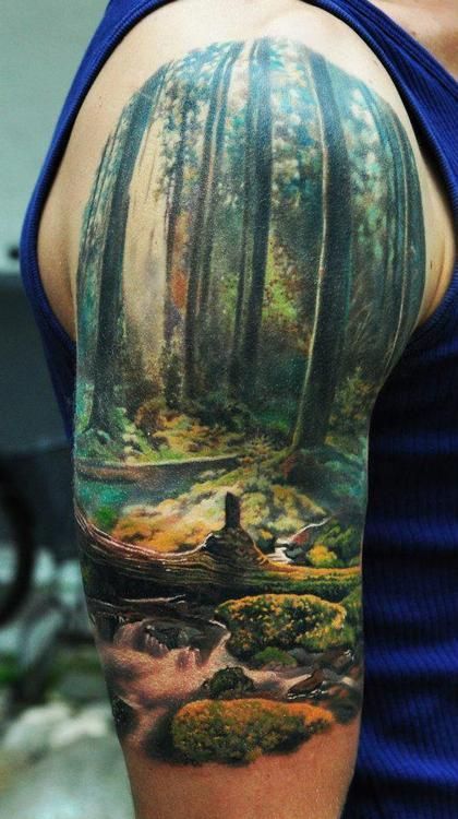 Genialny tatuaż z motywem natury, leśna sceneria, wysokie drzewa oraz runo. Wspaniałe kolory i doskonale wykonane szczegóły.