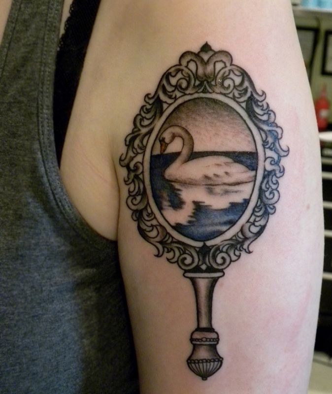 Tatuaż przedstawiający niewielkie lusterko w dekoracyjnej ramce. W odbiciu jest biały łabędź pływający po niebieskiej wodzie.