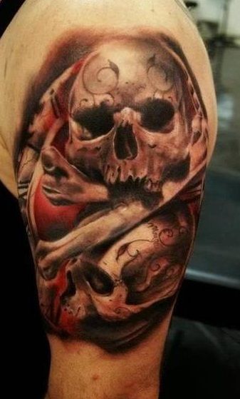 Dokładnie wypracowany tatuaż z czaszkami i kośćmi. Uwieczniony na ramieniu. Super kolorystyka tatuażu.