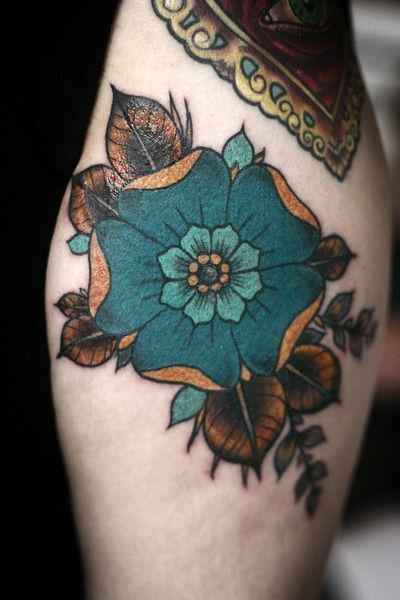 Tatuaż w kolorze z motywem kwiecistym. doskonałe wykonane i oryginalny pomysł.