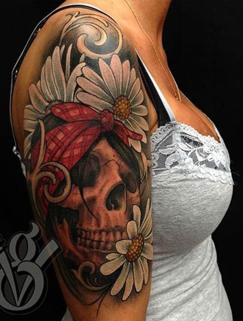 Tatuaż z białymi stokrotkami i damską czaszką w czarnych włosach, na których założona jest czerwona chustka.