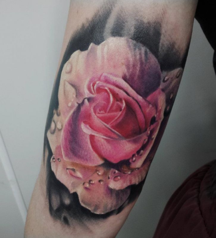 Bardzo dobrze wykonany tatuaż z kwiatem. Na róży są kropelki rosy.