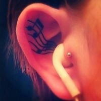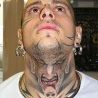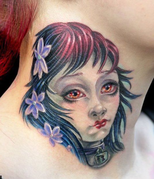 Bardzo dobrze wykonany tatuaż z twarzą młodej kobiety. Dziewczynka ma duże, niemal złote oczy, czerwono-czarne włosy, w które wplecione są trzy fioletowe kwiaty. Na szyi ma metalowa kłódkę.
